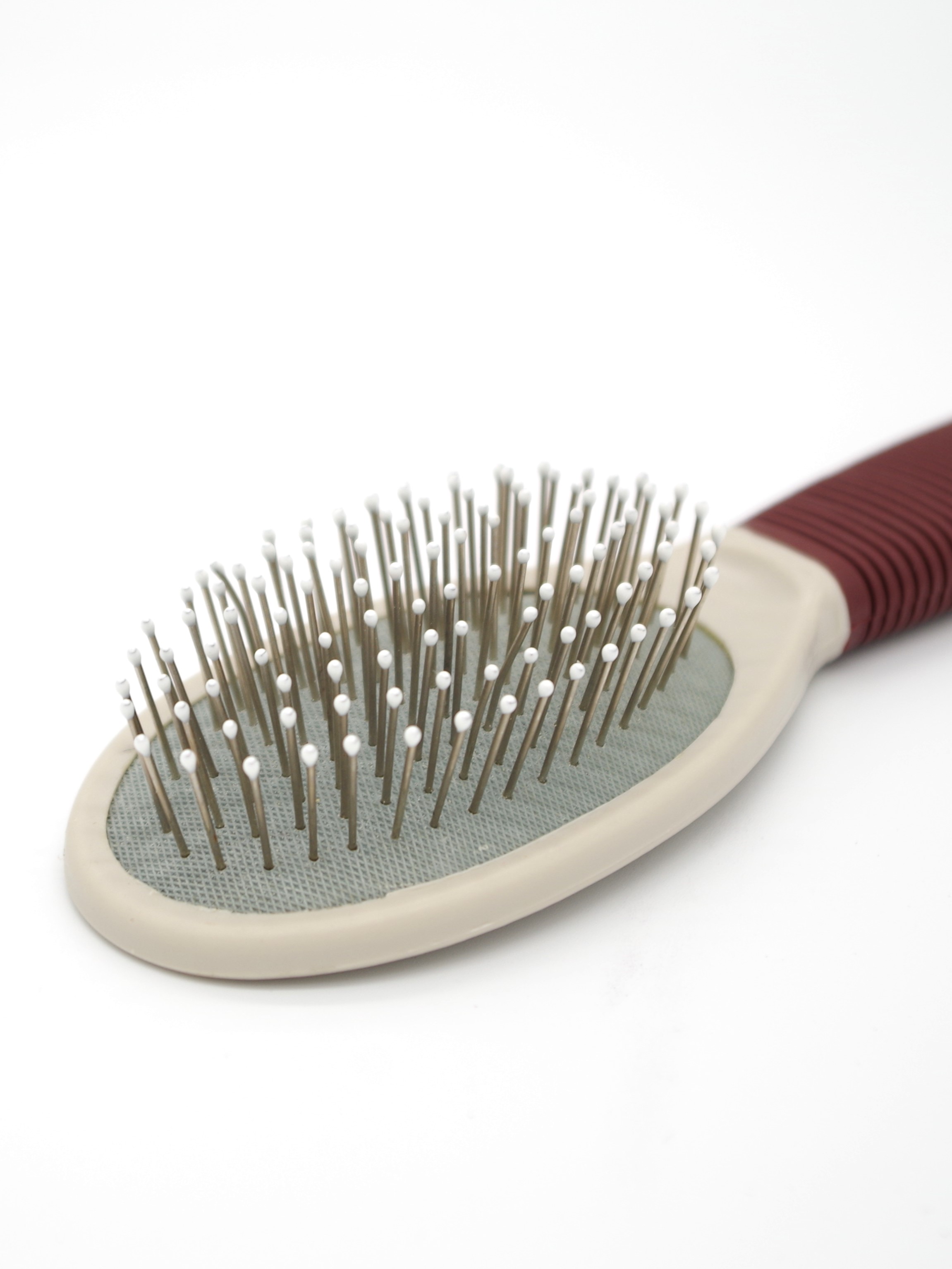 | 使用方法 | 【コーム】 親指、人差し指、中指でコームの中央を軽く握ります。 初めに粗め側で毛先からゆっくり大まかにときほぐします。 その後細め側で穏やかに調毛して仕上げます。 【ノミ取りコーム】 1. 使用前にブラシやクシで被毛のクシ通りをよくしておきましょう。毛並みに沿って根元からゆっくりとコームですいていきます。 また、ピンの間に抜け毛やゴミがたまるとすき間が広がりノミが逃げてしまうので、きれいに取り除きながら使用してください。 クシ通りをよくせず使用すると、ペットの毛を傷つけたり、商品が破損する場合があります。 2. コームでノミをすくい取れたら、指でつぶさないように、あらかじめ用意しておいた中性洗剤を洗面器などに入れて溶かしたお湯の中にノミを沈めて処理します。 ※ノミの卵が散りますので、つぶさないように気をつけてください。 3. コームについたノミをつぶさないように、ガムテープなどの粘着テープに接着して処理します。 【ピンブラシ(長毛用)】 ブラシを軽く握ります。 ※クッション部分の穴は空気穴です。ピンの欠損ではありません。 もつれ毛をほぐした後、地肌が見える程度に毛並みを分けながら、被毛を段々に少量づつ手入れしてください。 脚・腹部・背部の順にブラッシングするのが最適です。 ピン先で毛根を刺激し、健康な毛へと促します。 力を抜いて手に軽く持ち、回転させるように動かすのがコツです。マルチーズやシーズー、ヨーキーなどの長毛種には必ずピンブラシを使いましょう。 ※使用する際、静電気防止スプレーを併用することをオススメします。 |
