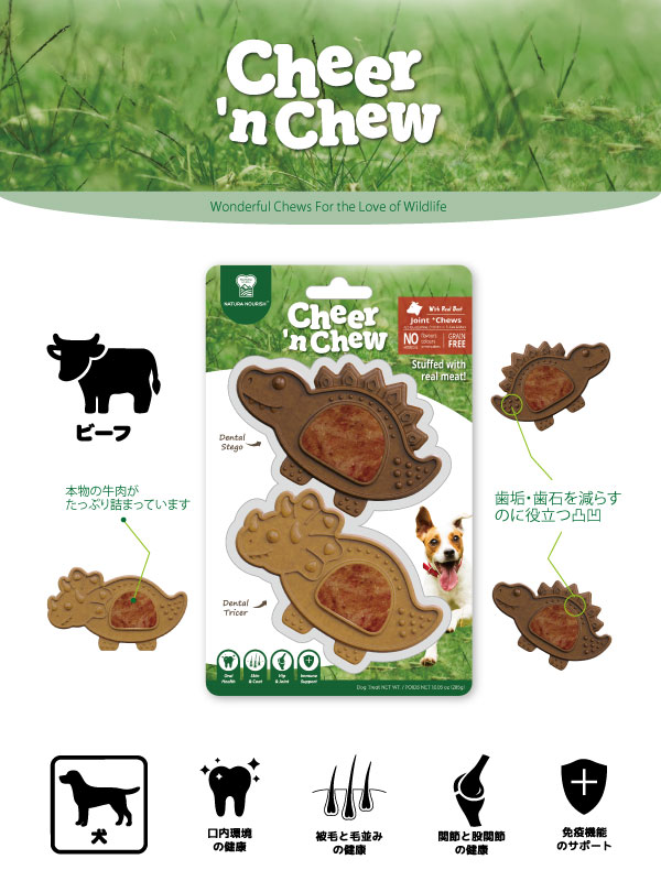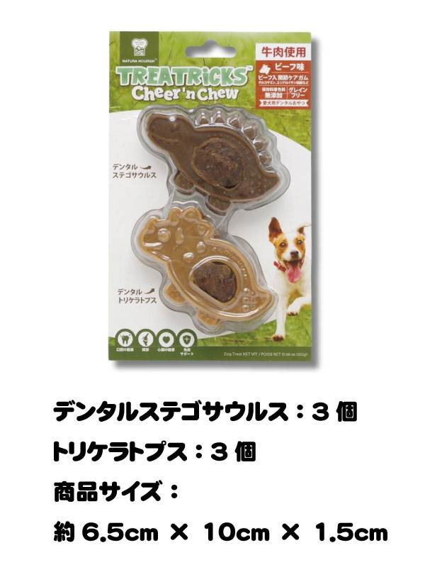 ユニークで可愛らしい「デンタルステゴサウルス」と「デンタルトリケラトプス」の6体セット。 噛むことで歯垢・歯石をケアしながら、グルコサミン・コンドロイチン配合で、愛犬の関節の健康もサポートします。 ◇グレインフリー(穀物不使用) トウモロコシ・麦・大豆などの穀物を一切使用していません。アレルギーに配慮したレシピです。 ◇無添加で安心 人工の保存料・着色料・香料は使用しておらず、自然の美味しさをそのままに。 ◇副産物不使用 家禽類の副産物は一切使用しておりません。主原料には良質な牛肉を使用しています。 |