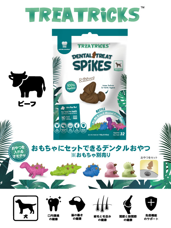 ・対応するTREATRiCKSトイの背中にスパイクをセットして、噛んで遊びながらトリーツタイム! ・スパイクを食べ終えると、トイ内部に入ったおやつが徐々に出てくる仕組み。知育効果・集中力UPにも最適です。 ・スパイクはそのままご褒美トリーツとして単独で与えることも可能です。 |