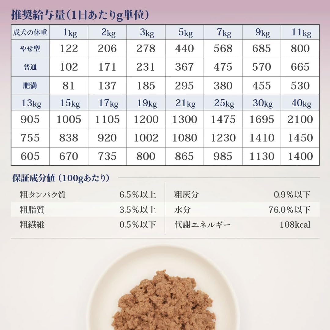粗タンパク質6.5%以上、粗脂肪3.6%以上、粗繊維0.5%以下、粗灰分0.9%以下、水分76.0%以下