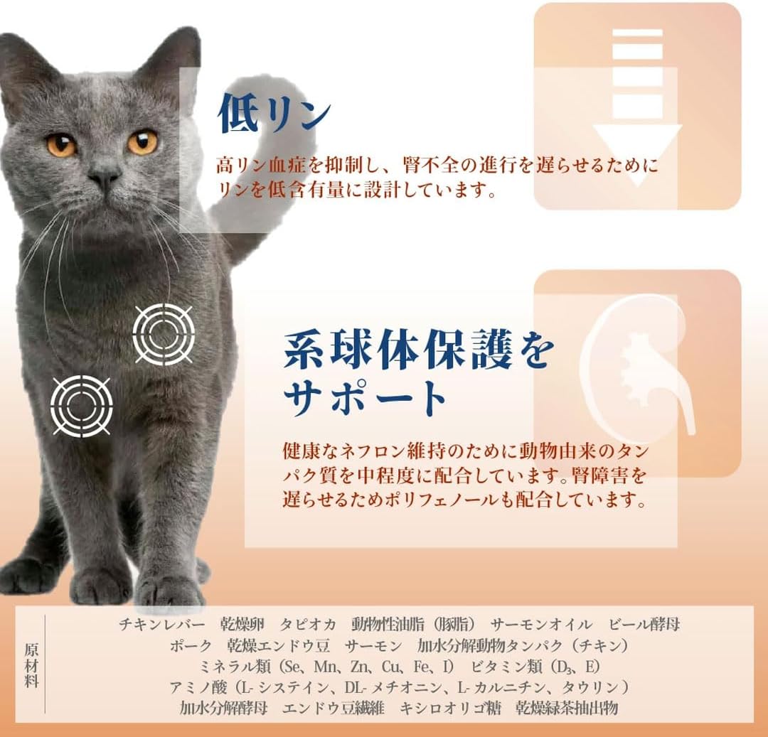 | 商品概要 | 猫用腎臓&シュウ酸塩サポートは、慢性腎不全の猫に給与するために設計された食事療法食です。 尿毒症やタンパク尿症に配慮し、リンやたんぱく質の含有量を調整しています。 また、オメガ3脂肪酸を豊富に配合し、腎臓の働きをサポートします。 |
