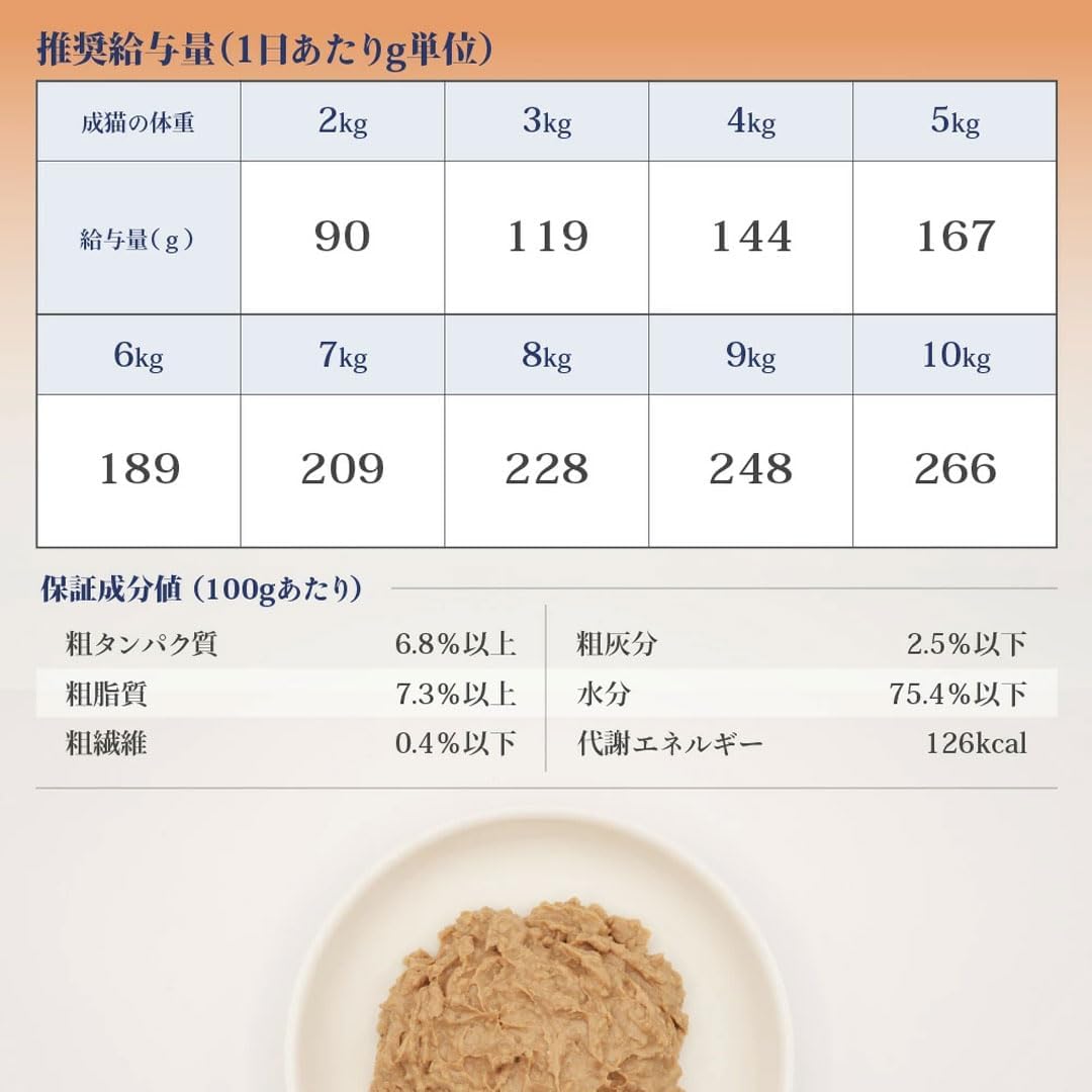 | 保障成分値(100gあたり) | 粗タンパク質6.8%以上、粗脂肪7.3%以上、粗繊維0.4%以下、粗灰分2.5%以下、水分75.4%以下 |