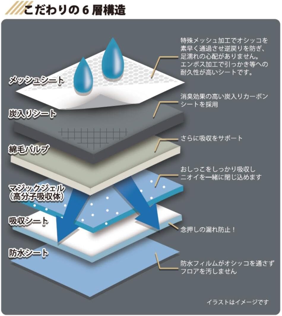 炭の力で強力に消臭し、厚型タイプの6層構造がしっかりと吸収するペットシートです。 ◇炭の力でしっかり消臭 竹炭を含んだ吸収層が、気になるニオイを吸収し、閉じ込めます。 帰宅時や来客時も、嫌なニオイが気になりません。 ◇安心の超吸収力 1枚で約10回分(約300CC)※のオシッコを吸収できます。 ※目安として 猫・小型犬オシッコ1回分…約30cc、中型犬オシッコ1回分…約50cc ◇足元さらさらで快適 特殊メッシュ構造により、尿をすばやく内部に閉じ込め、表面はいつもサラサラ。 ペットの足が濡れにくく、衛生的です。 ◇6層構造&厚型タイプ 表面から防水フィルムまで、多層構造で漏れを防止。床を汚さず、安心してお使いいただけます。 |